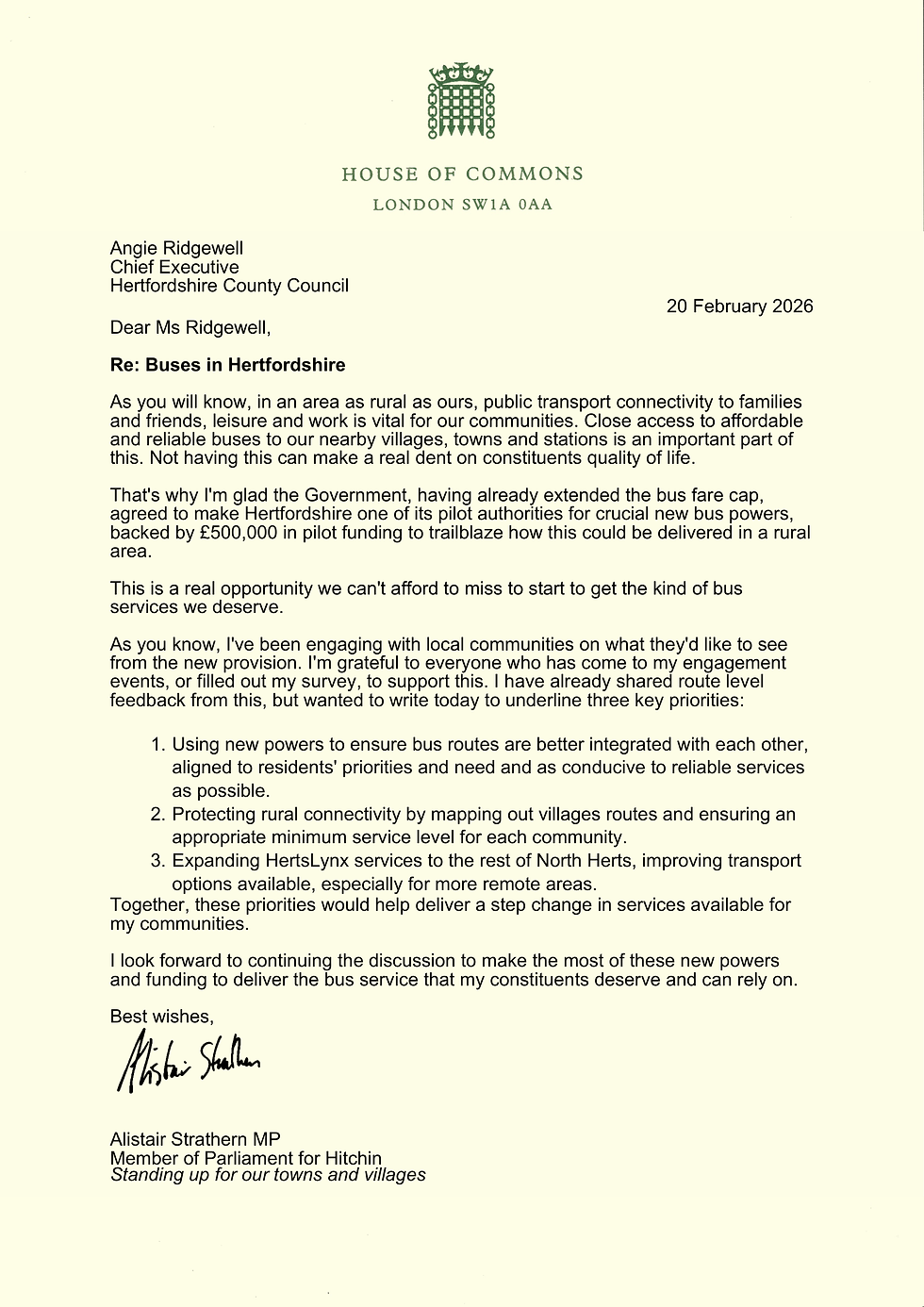 Alistair Strathern, MP for the Hitchin constituency, has urged Hertfordshire County Council (HCC) to make use of new legal powers and funding to improve local bus services.